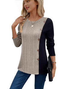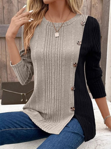 大量の既製品のヨーロッパとアメリカの独立したステーションの新しい女性用カラーブロックコントラストボタンボトムシャツスリットカジュアルトップス