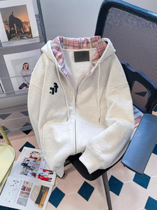 アメリカ式の怠惰な風が色の格子にぶつかって帽子の衛衣の男女の秋冬のゆったりしたデザイン感の小さい大衆のコートのカーディガンをつなぎ合わせます。