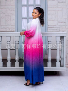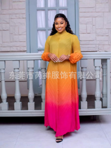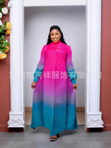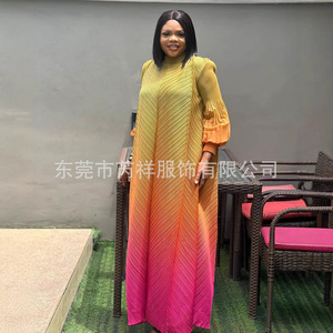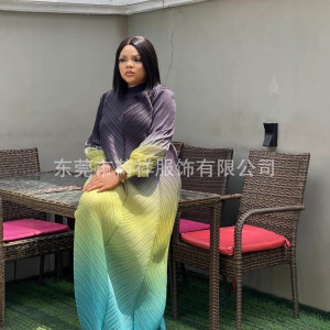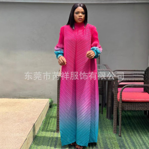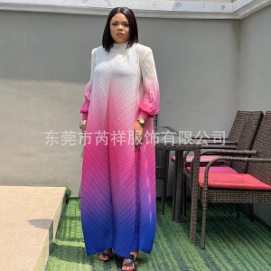 ミヤケ三宅しわ丸首グラデーション色灯籠袖長袖中東ロングスカート