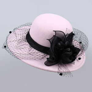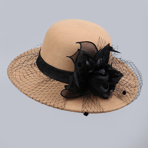 秋冬の新型の赫本風の大きい軒の毛の帽子の英倫の復古のフェルトの帽子の神秘的な網の紗の花の宴会の帽子