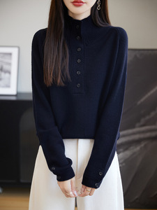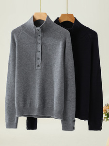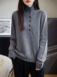 100ウールセーター女性秋冬韓系ボタン半開襟ニット上着ゆったりとした立襟セーター