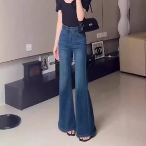 レトロな青いラッパの広脚ジーンズの女性2025秋の新型の高腰がゆったりしていて、やせているストレートのズボンが見えます。