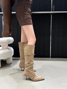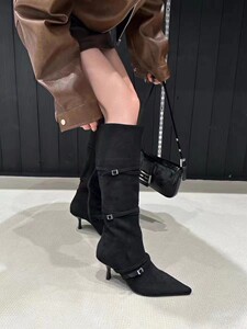 ブーツの女性の細いベルトのスエードの細いヒールの先の長いブーツのハイヒールは膝のやせている靴を越えません。