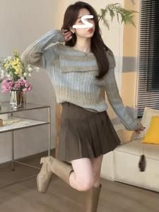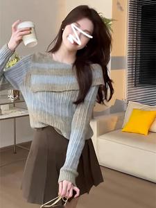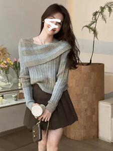 2024秋冬の衝突色グラデーションデザイン感一字襟セーター女性気質偽二枚のインナーニット上着