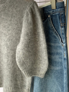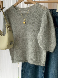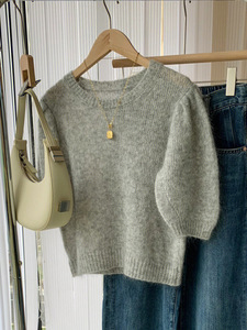 グレー馬海毛半袖セーター女性春秋優しい外着ゆるい丸首ニット感上着