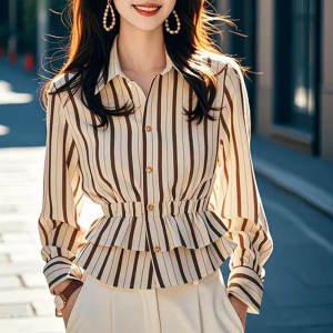 2024秋杏底カレーストライプウエスト長袖シャツ女性モコ魚元創綺麗レトロ香港風高級感上