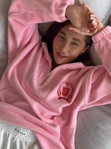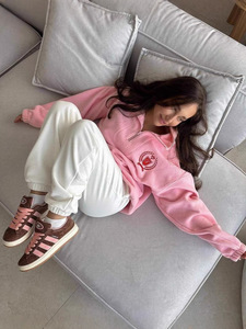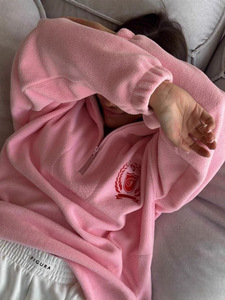 速売通の起爆バッジのプリントがゆったりしていて、怠惰な風が肩の袖の長袖の半ファスナーのフリースの女性服に落ちます。