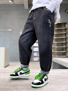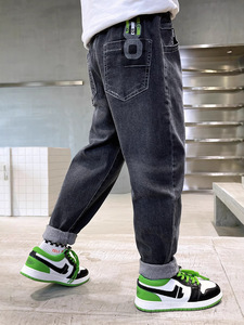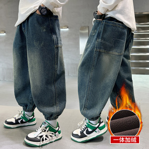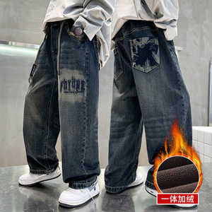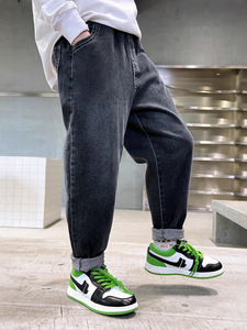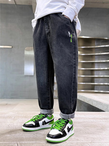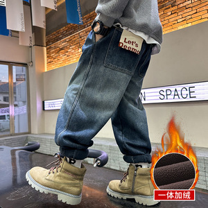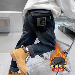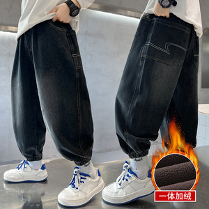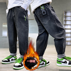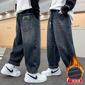男の子パンツ秋冬 2025 新しい中型および大型男の子冬カジュアルパンツ子供ベルベット厚いジーンズ