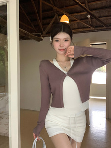 韓国のvネックの偽の2つの首の長袖のニットのニットの秋の女装の新型の中で身を修めるのはやせている気質の上着を現します。