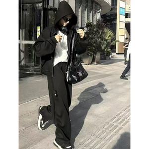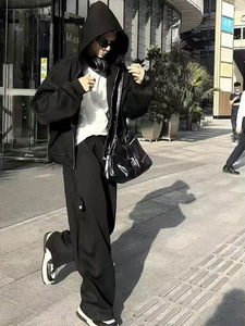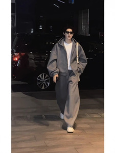 秋の新型男性ファッション空気層フード付きのゆったりした長袖コートカップルスポーツカジュアルセット
