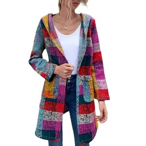 アマゾンのクロスボーダーのファッションの女性の格のニットのレトロな格子のプリントは帽子のパーカーのカーディガンと一緒に毛のオーバーをつかみます。
