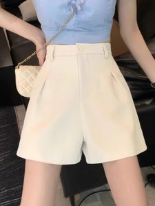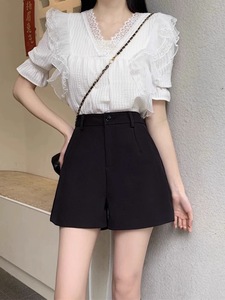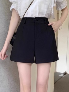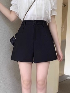 黒いスーツの半ズボンの女性の春の夏の大きいサイズのハイウエストのa字のカジュアルなズボンの外は広い足のズボンを着ています。