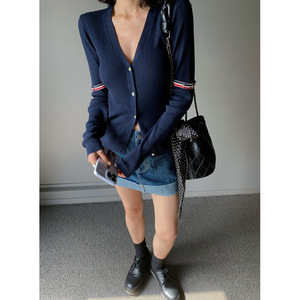 韩版V领织带针织衫开衫女秋新款时尚气质洋气减龄设计感上衣潮流