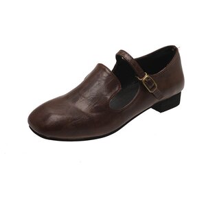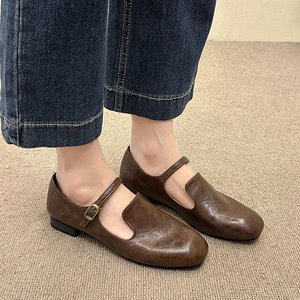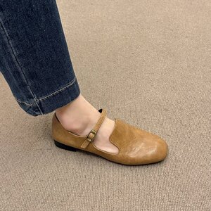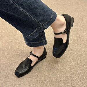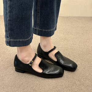レトロなソフトレザーの黒のメリージェーンシューズ、レディース、トレンディなワンラインバックル、ソフトレザー、ローヒール、ラウンドトゥ、カジュアルで万能な浅口シューズ
