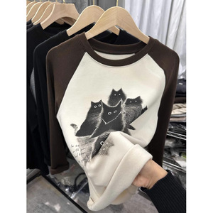 2206 # 【2025】280g ドイツ製デロン素材 猫柄配色 リバーシブルデロン素材 ラグラン袖 レディース秋冬用インナーシャツ
