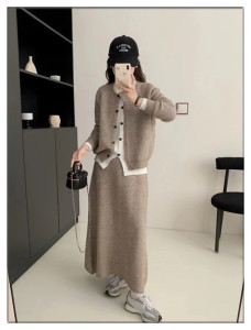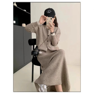 韓国版の怠惰な風の偽の2つのニットのスーツの女性の秋冬の新型のゆったりした丸首のセーターの半身のスカートの2つのセット