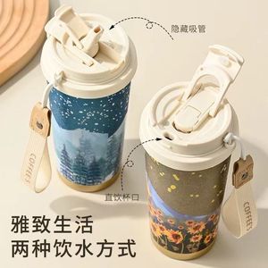 ゴッホチタンカップ保温カップ女子学生高颜値養生泡茶ストローカップ携帯コーヒーカップ茶水分離カップ