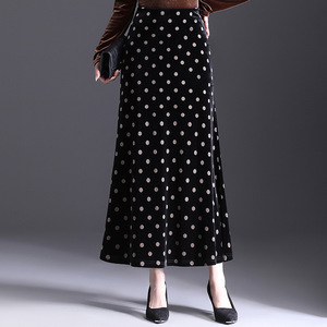 金のベルベットの波点の魚の尾のスカートの半身のスカートの秋の一歩のスカートの中の長い段のハスの葉の辺は尻を包んでやせているプリントの長いスカートを現します。
