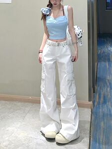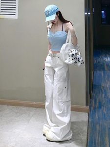 アメリカンハイストリートスタイルの女性用白いオーバーオール、2025年春秋の薄手でゆったりとしたワイドレッグ、スリムで多用途なカジュアルパンツ、トレンディです。