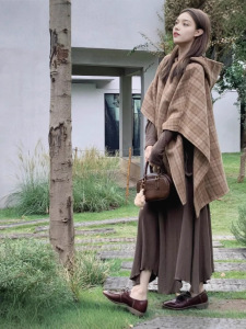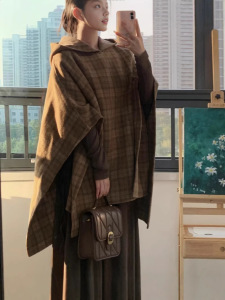 2024秋冬古着少女/bbr风冬日乖巧格纹宽松连帽斗篷大衣女