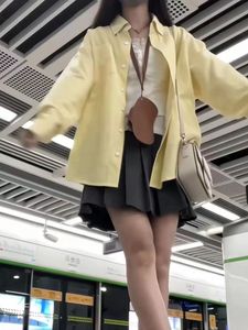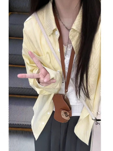 春と秋のストライプのシャツの女性の中には、日本のゆったりとした長袖のシャツを重ねて着ています。