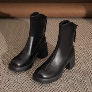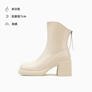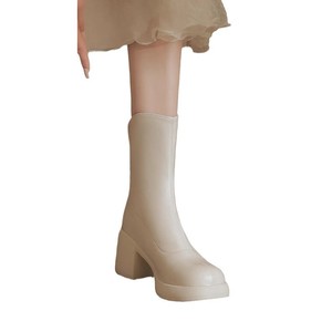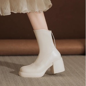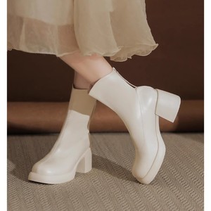 レトロな白系の太いハイヒールの後にファスナーのマーティンの靴を合わせます。