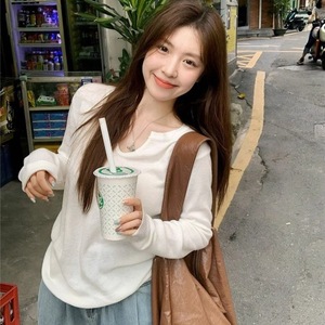 韓国系vネックの肩の長袖のニットの女性の秋冬はゆったりしていて、やせています。