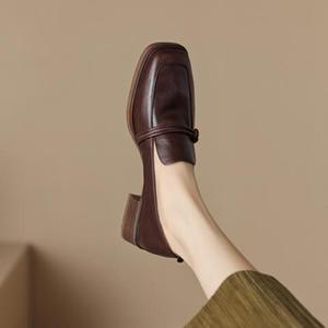 フレンチブラウンのチャンキーヒールレディースレザーシューズ、2025年春の新作、多用途、レトロスタイル、スクエアトゥ、ミッドヒールレディースシューズ