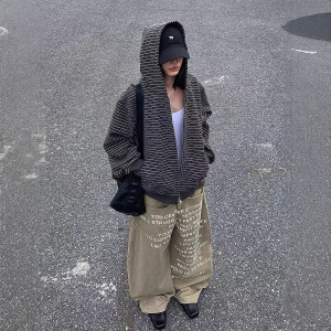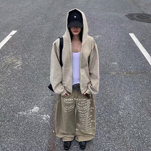韓国風ストライプジッパーカーディガンパーカー レディース 秋 ヴィンテージ ゆったり ラフスタイル リラックス感 スイートガール トップス トレンド