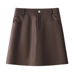 コーヒー色のレザー風Aラインスカート レディース 2025年秋冬新作 ハイウエスト 着痩せ効果 エレガントなヒップスカート 着痩せ効果のあるショートスカート