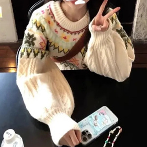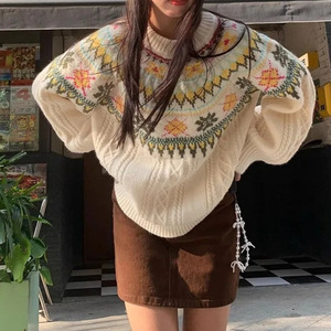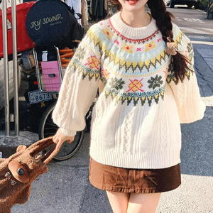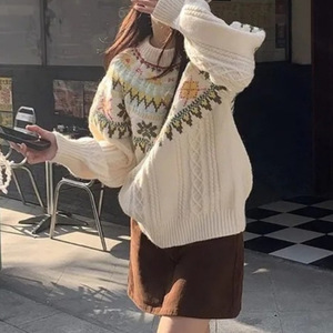 秋冬新款慵懒设计感民族风重工提花圆领套头针织衫