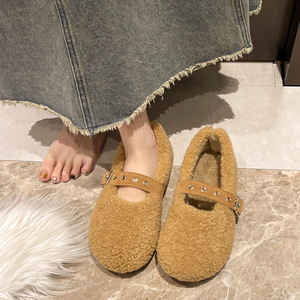 小香風フランスの平底毛羽立ち靴の女性は秋冬外に2024の新型の足にベルベットのメアリージェーンの靴を履いている
