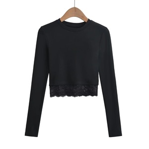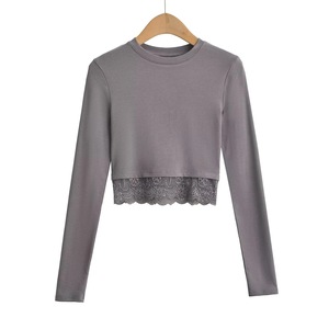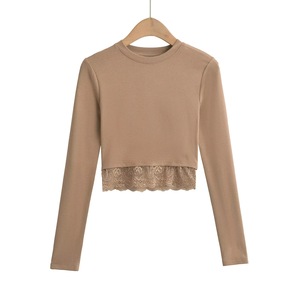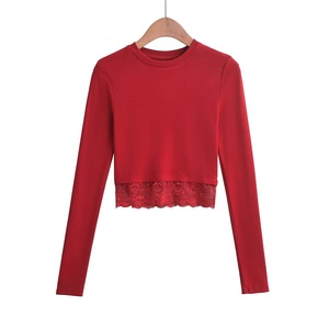 長袖のフランスの新型の2024ショートtシャツはギャルのレースの底の丸首の女性の修身の上着のワインレッドをつなぎ合わせます。