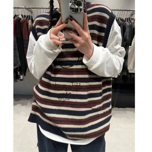 春の服の韓国版のゆったりした大きいサイズの太ったmmの怠惰な風のメリヤスの笑顔の刺繍のストライプのニットのセーターのベストの女性の上着