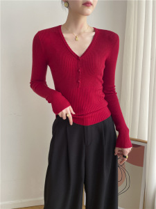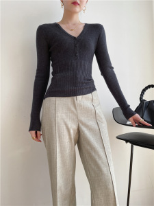 秋の新型カシミヤvネックの半開胸の純色の長袖はスリムに見えます。