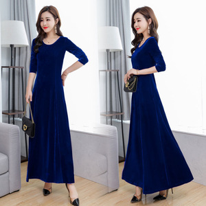 春秋冬の新型の金のベルベットのワンピースの気質の長い丸首の長袖のチャイナドレスの大きいサイズの女性の底のスカートの長いスカート