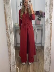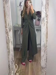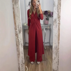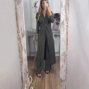 ヨーロッパとアメリカの秋の新作カジュアルルーズレディースVネック無地スリットドレスとズボンの2点セット