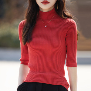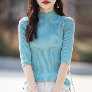 綿半袖ボトムシャツ春と秋のハーフタートルネック薄手のトップ女性のスリムフィット七分袖セーター女性卸売