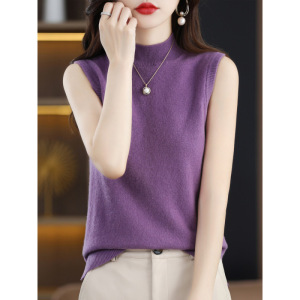 半高襟ベストの女性の袖なしの底のシャツの中に秋の黒い底のシャツのゆったりしているニットの上着を掛けて夏を着ます。