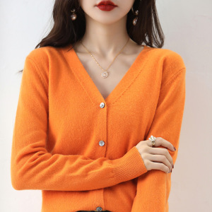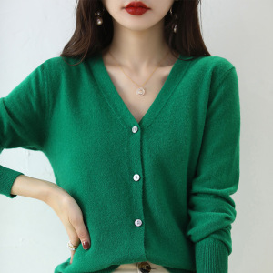 春と秋の新型vネックニットカーディガンの女性服のゆったりとした大きいサイズの純色のセーターの短いコートの上着