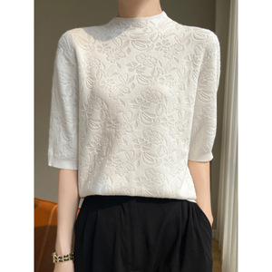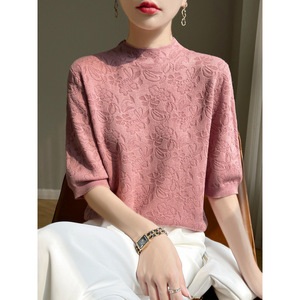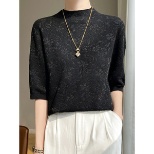 夏の薄いタイプの半高襟のジャカードのニットの上着の女性の気質はゆったりしていて、着痩せしています。