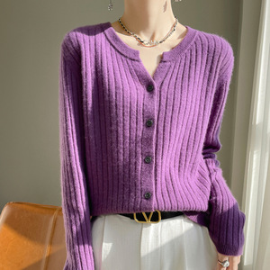 新商品の純色の丸首のニットは外に韓国版の修身単列ボタンの気質の通勤坑条のカーディガンのセーターの女性を掛けます。