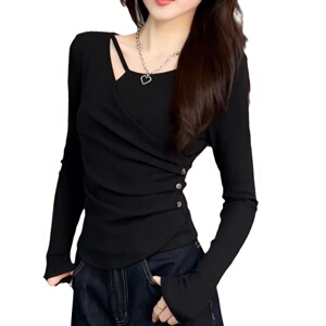 デザイン感のある長袖のデコルテtシャツの女性春と秋の2025韓国版の新型は腰を収めて身を修めてやせています。