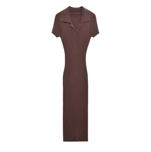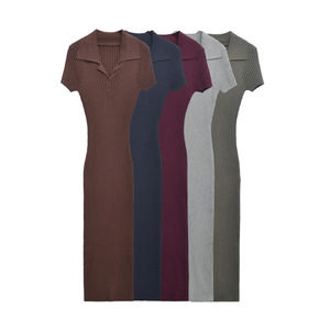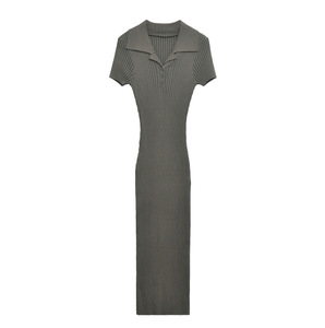 25春の新型女性欧米風ギャル純色ファッション気質襟リブ編み半袖包尻ワンピース