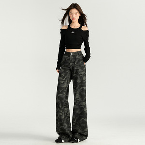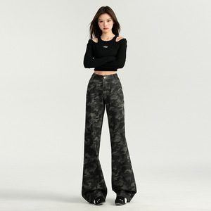 アメリカ式高街微ラッパ迷彩工装ジーパンギャル女秋冬新作低腰ゆったり広脚ラッパズボン