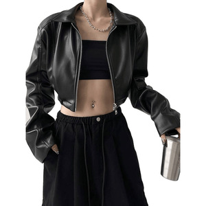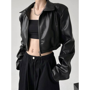 アメリカのレトロな長袖の襟の皮のコートの女性の2024春の秋の甘いクールな妹の機関車のジャケットの短い上着