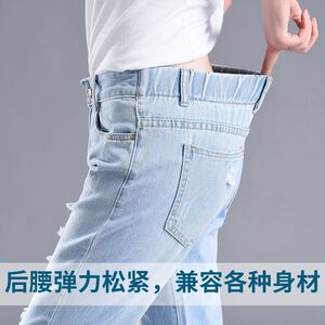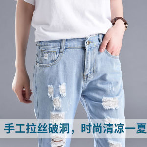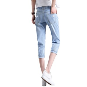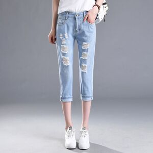 穴が開いているジーパンの女性は腰がゆったりしていて、やせています。