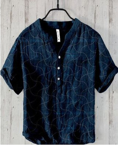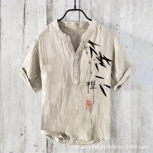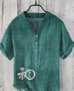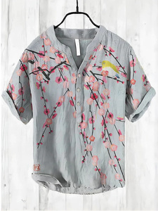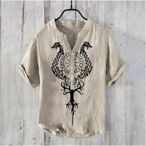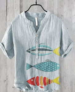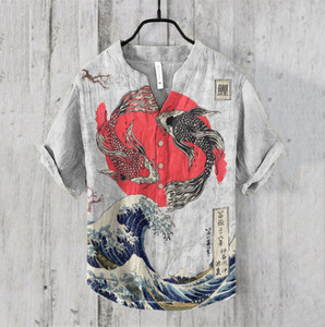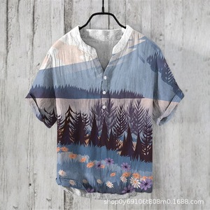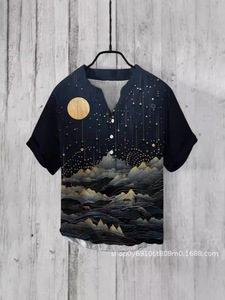 2024クロスボーダー夏热い贩売デジタルプリント3ボタンvネックメンズカジュアル薄手半袖动物景色ゆるい