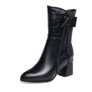 サイドジッパー付きマーティンブーツ、女性用チャンキーヒール、秋冬新作、ベルベットリボン付き、ポインテッドトゥ、ミッドヒール、スリムショートブーツ