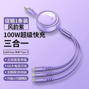 100W超级快充一拖三手机伸缩数据线三合一快充TC适用苹果华为安卓
